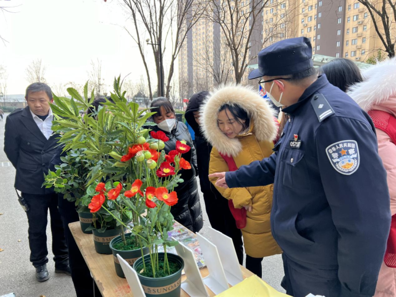 “这可不是普通的花,这就是我们一直说的‘罂粟’……”对着围观仿真植物的群众,民警详细讲解罂粟、大麻等毒品原植物特征、性状及非法种植毒品原植物应负的法律责任,号召群众积极举报毒品违法犯罪行为。
