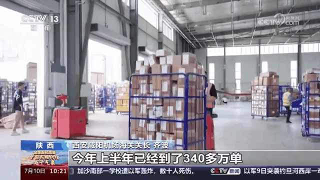 西安咸阳机场海关关长齐波:“去年我们首次突破了700万单,全国排第五名,内陆排第一名。今年上半年,已经到了340万单,比去年同期增长1.5%左右。”