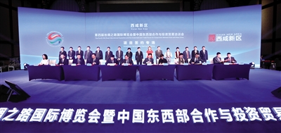 5月10日,在第四届丝绸之路国际博览会暨中国东西部合作与投资贸易洽谈会开幕之际,西咸新区举办投资环境推介暨重点项目签约会。38家企业分别与西咸新区空港新城、沣东新城、秦汉新城、沣西新城、泾河新城和能源金融贸易区签约。项目包含绿地西北运营中心暨全球商品交易基地、西咸半导体科创园、西安临空产业港、陕西智慧车联网平台、西北建设集团总部、新恒业新能源产业基地等。签约总额达到了749亿元。