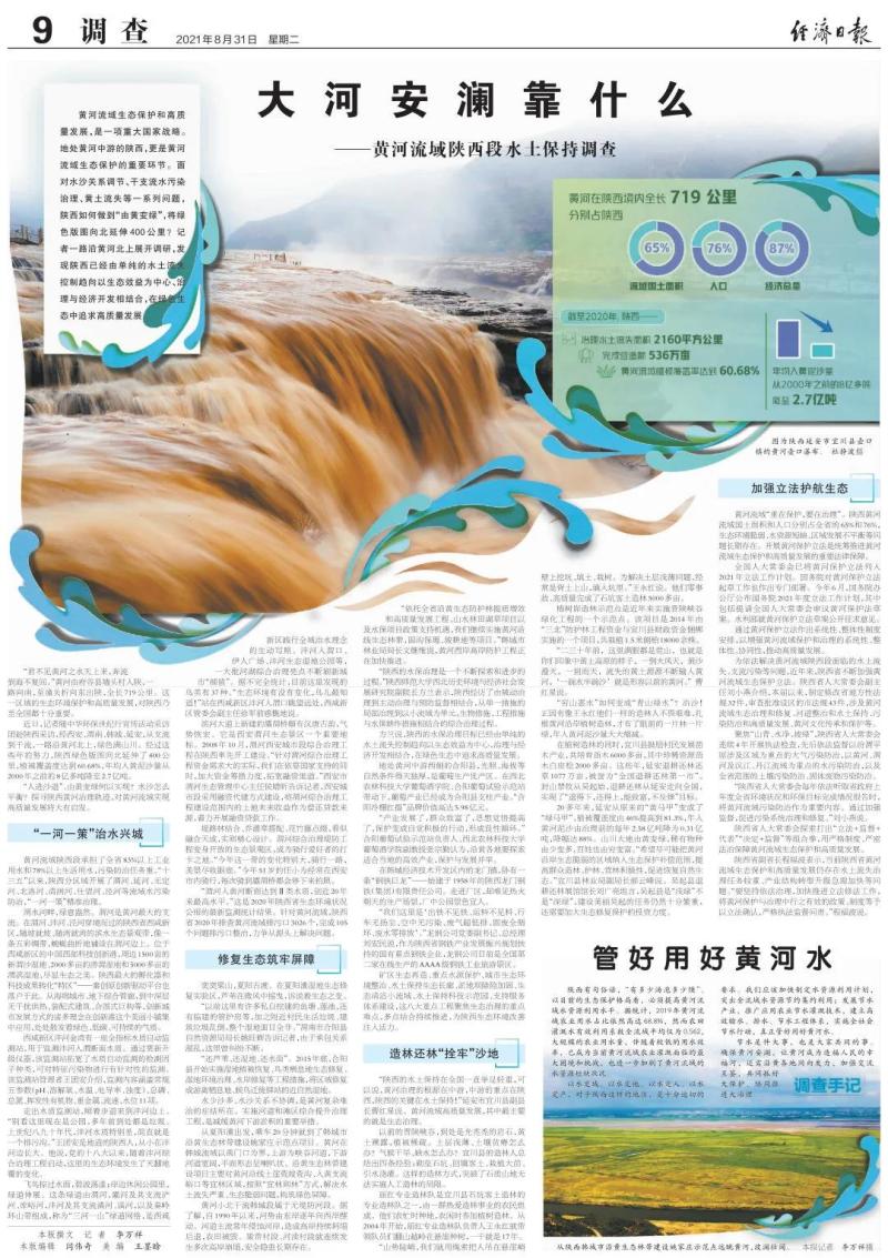 黄河流域陕西段承担了全省83%以上工业用水和78%以上生活用水,污染防治任务重。“十三五”以来,陕西分区域开展了渭河、延河、无定河、北洛河、清涧河、仕望河、泾河等流域水污染防治,“一河一策”精准治理。