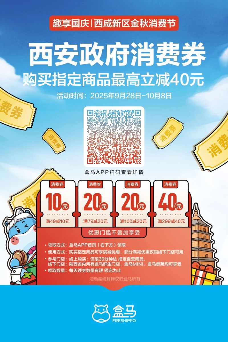 9月28日至10月8日,“趣享国庆,西咸新区金秋消费节”正式开启,西咸新区电商平台消费补贴活动也将同步上线,本次活动券包总价值400万元,陕西省内盒马门店均可使用。