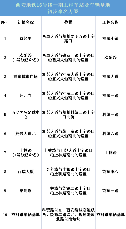 西安地铁16号线一期工程已全面开工建设,经西咸新区轨道公司组织专家现场踏勘,征求新区各部门意见研究形成了初步命名方案。为进一步提升地铁服务功能,提高车站命名公众参与度,体现民声民意,现将地铁16号线一期工程车站和车辆基地初步命名方案公布如下,欢迎大家提出宝贵意见。