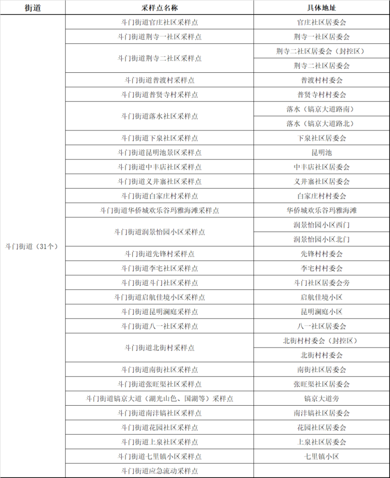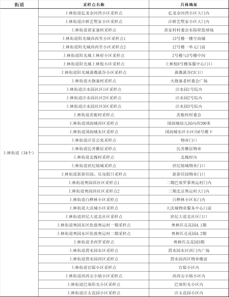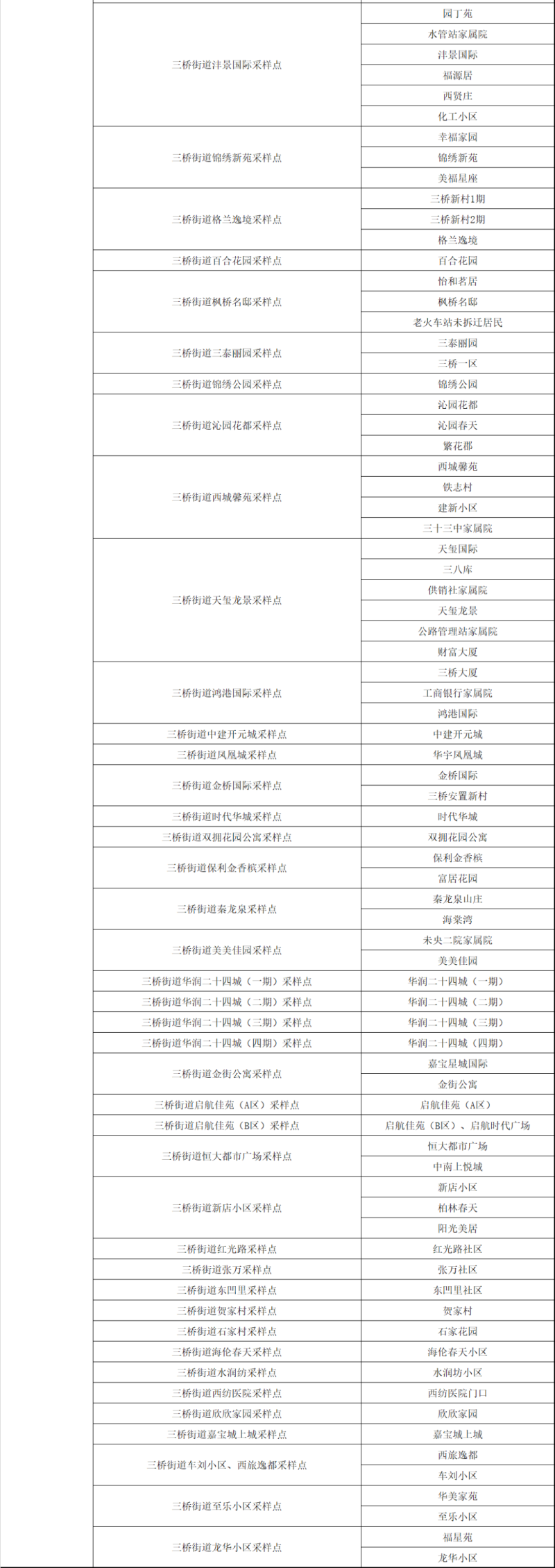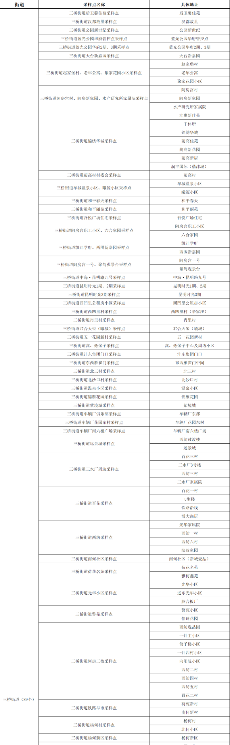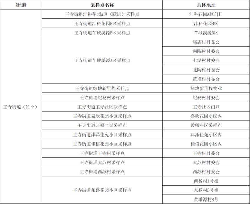 核酸检测采样点及具体时间安排以各街道办事处、社区(村)、单位通知为准,根据检测需求可能进行调整,请居民群众留意街道、社区(村)通知,或拨打新区咨询服务电话了解最新采样点信息。具体地点详见后附表格。