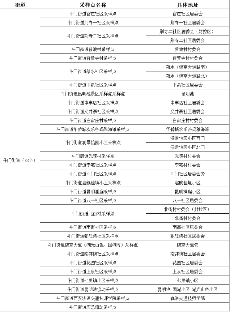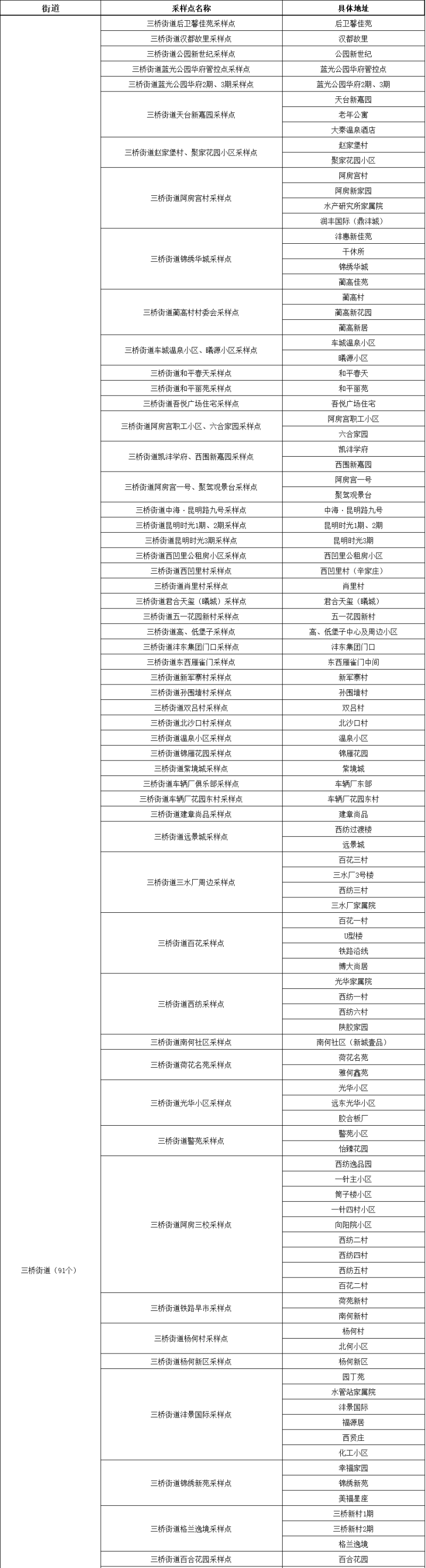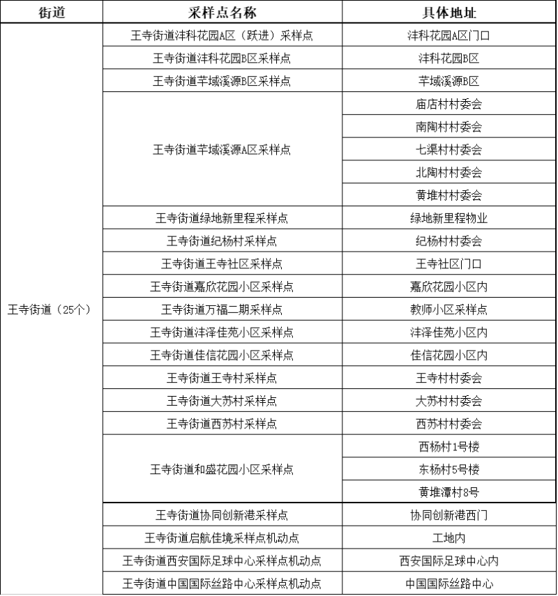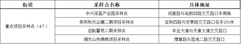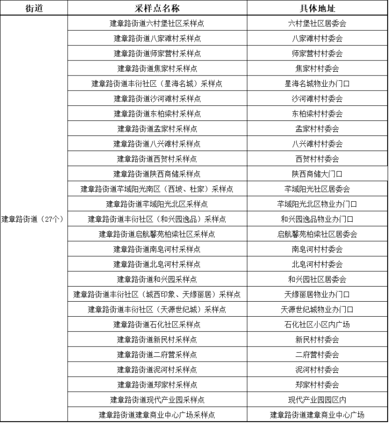 核酸检测采样点及具体时间安排以各街道办事处、社区(村)、单位通知为准,根据检测需求可能进行调整,请居民群众留意街道、社区(村)通知,或拨打新区咨询服务电话了解最新采样点信息。具体地点详见后附表格。