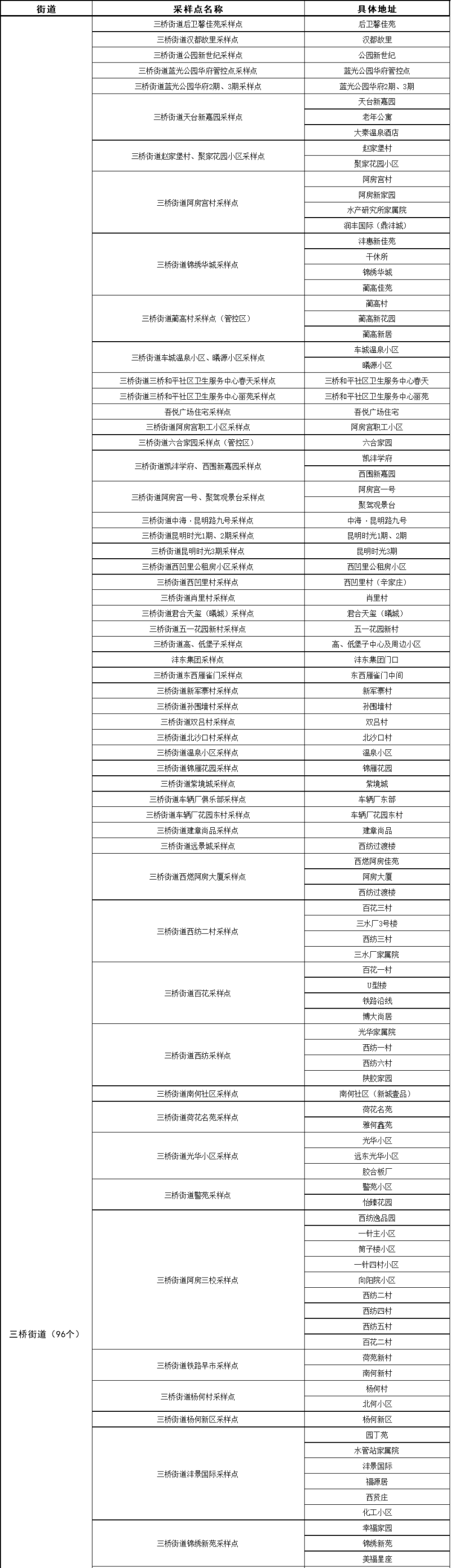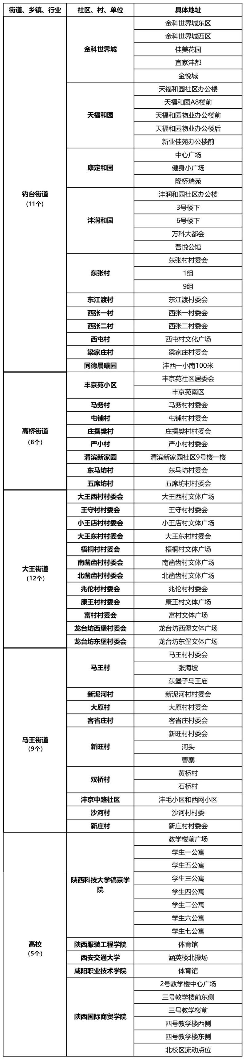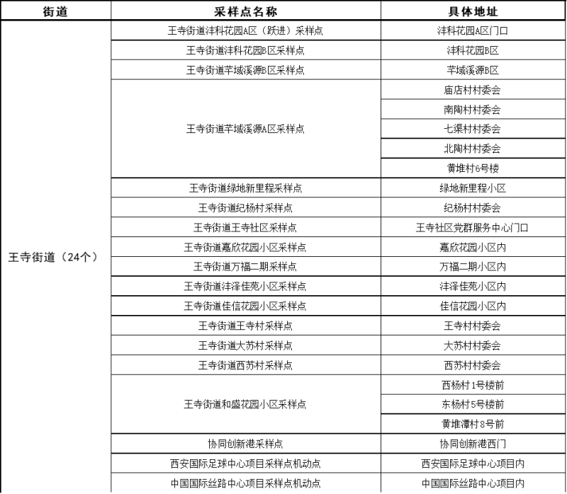 核酸检测采样点及具体时间安排以各街道办事处、社区(村)、单位通知为准,根据检测需求可能进行调整,请居民群众留意街道、社区(村)通知,或拨打新区咨询服务电话了解最新采样点信息。具体地点详见后附表格。