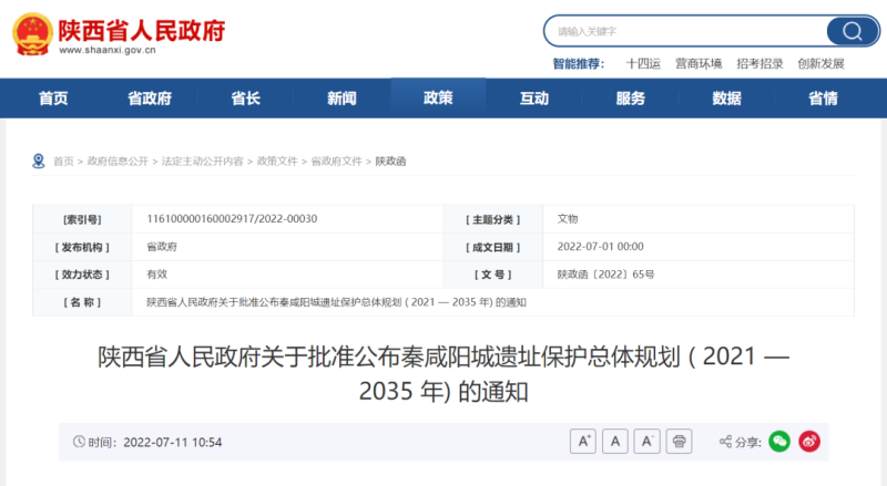 陕西省人民政府日前公布了批准秦咸阳城遗址保护总体规划(2021—2035年)的通知。