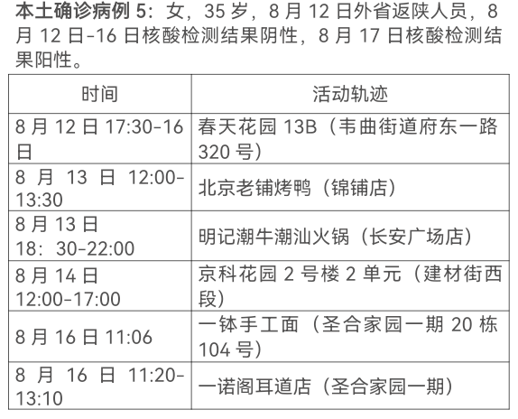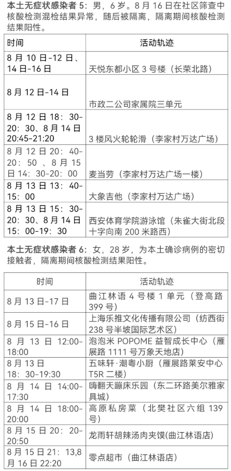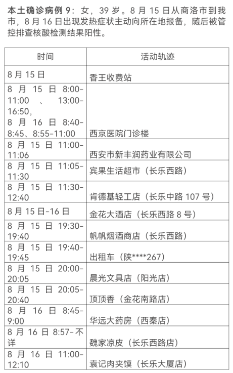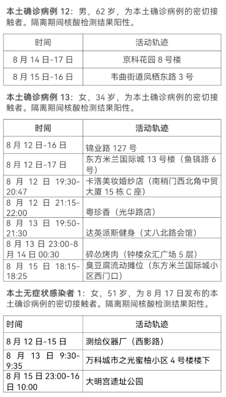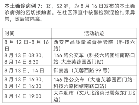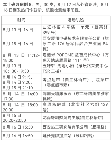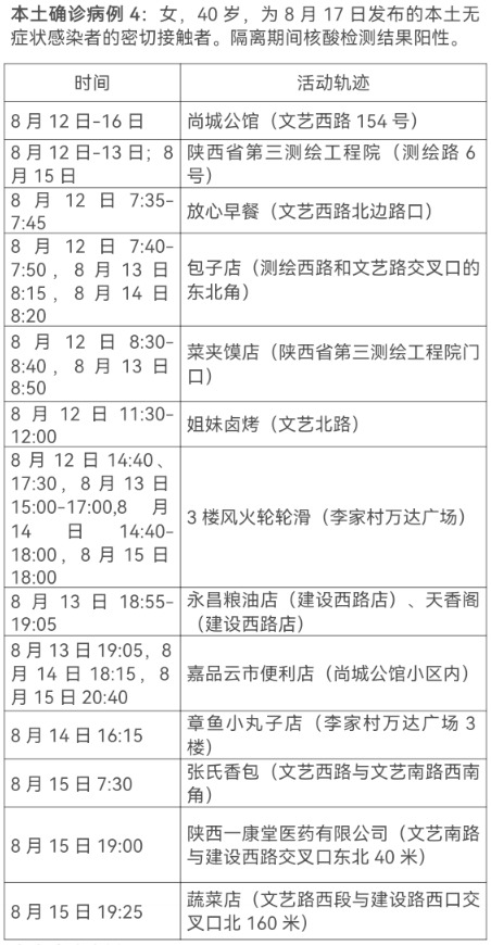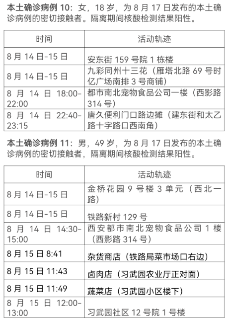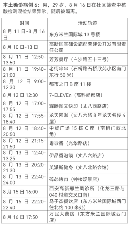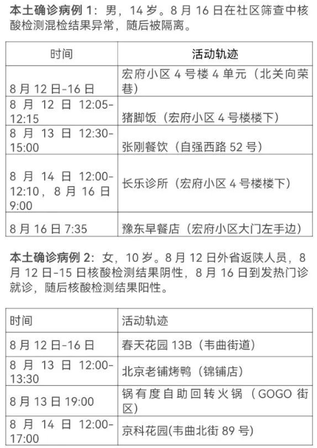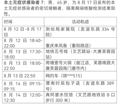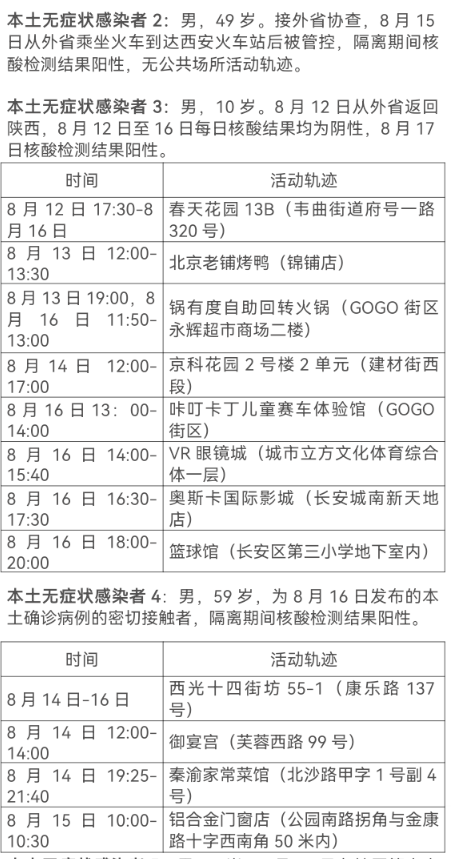 8月17日0-24时,西安市新增13例本土确诊病例(普通型1例,轻型12例),7例本土无症状感染者。通过集中隔离发现10例,社区筛查5例,外省返陕人员4例,商洛返回西安人员1例,主要活动轨迹如下: