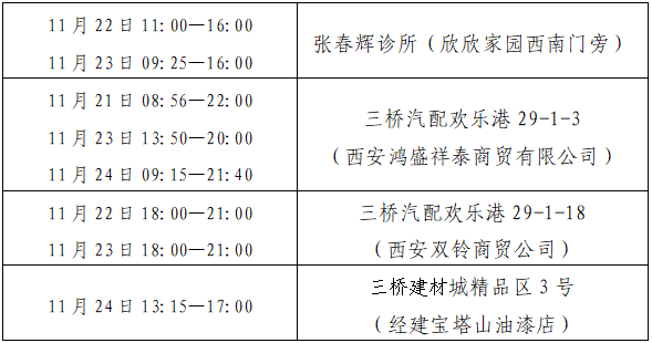 现有新冠肺炎阳性病例曾于11月21日至11月24日在以下4处点位有活动轨迹,请与以下轨迹有交集的人员立即主动向属地疫情防控部门、社区(村)或单位报告,停止外出活动,在原地(或居家)等候,严格做好个人防护,并配合落实相关管控措施。