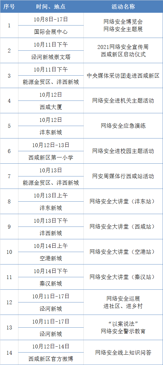 2021年国家网络安全宣传周西咸新区活动将持续至10月17日。活动期间,新区除开展咨询服务、开办网络安全大讲堂、举办网络安全知识问答外,还将充分利用校园日、电信日、法治日、金融日、青少年日、个人信息保护日这“六个主题日”,进社区、进农村、进企业、进机关、进校园、进军营、进家庭,线上线下相结合开展网络安全系列主题活动。活动内容形式多样、针对性强,有立足青少年的网络安全科普教育,也有针对老人的适老化服务等,有学习参观、专题报告会、社区公开课、满意度调查,也有文艺创作、知识竞赛、主题团课队课及志愿服务等,扎实推进网络安全宣传周活动走深走实。