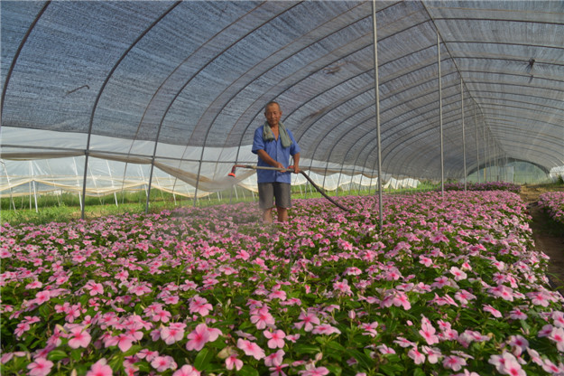 (司家庄村张少发正在苗木花卉基地给花浇水)